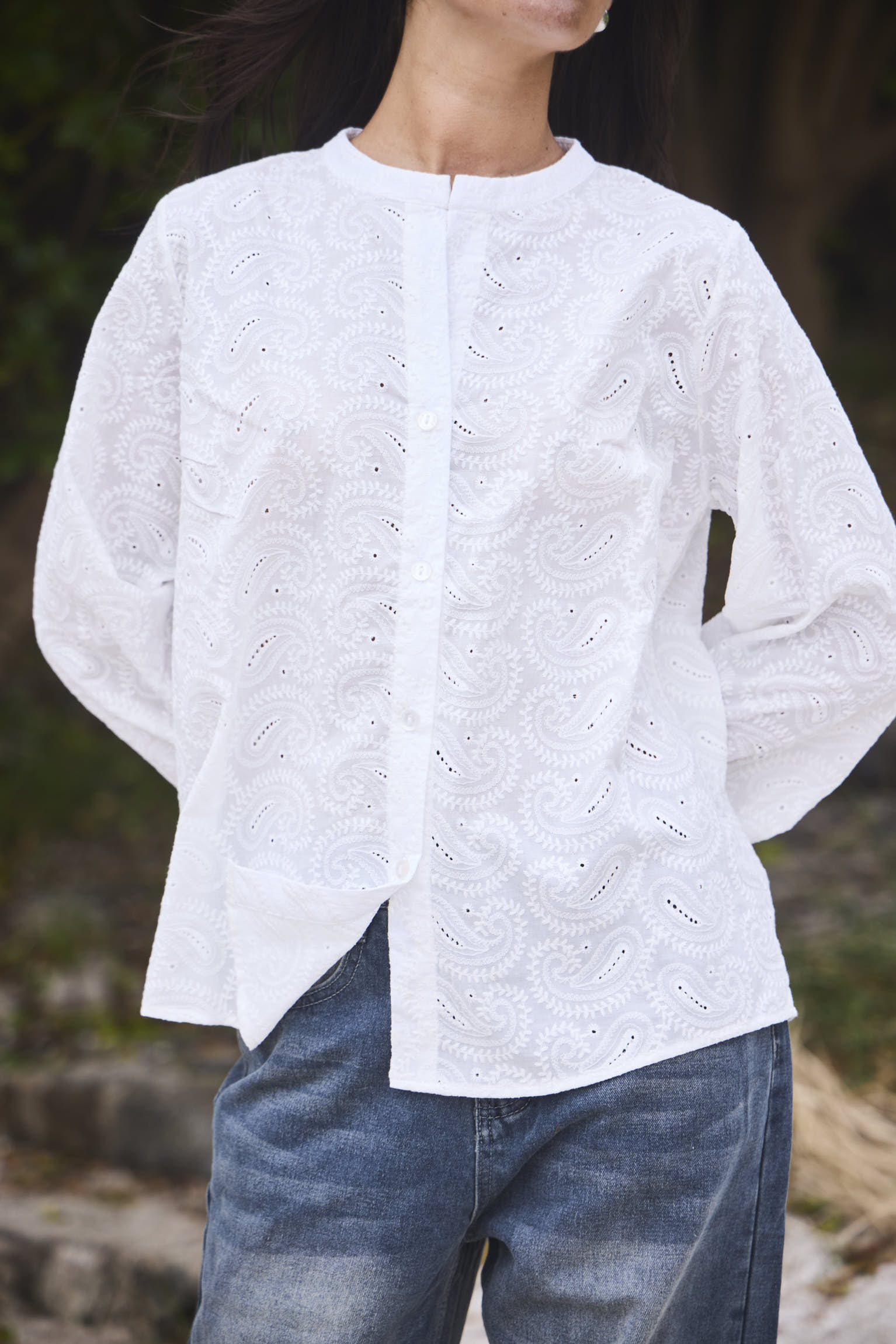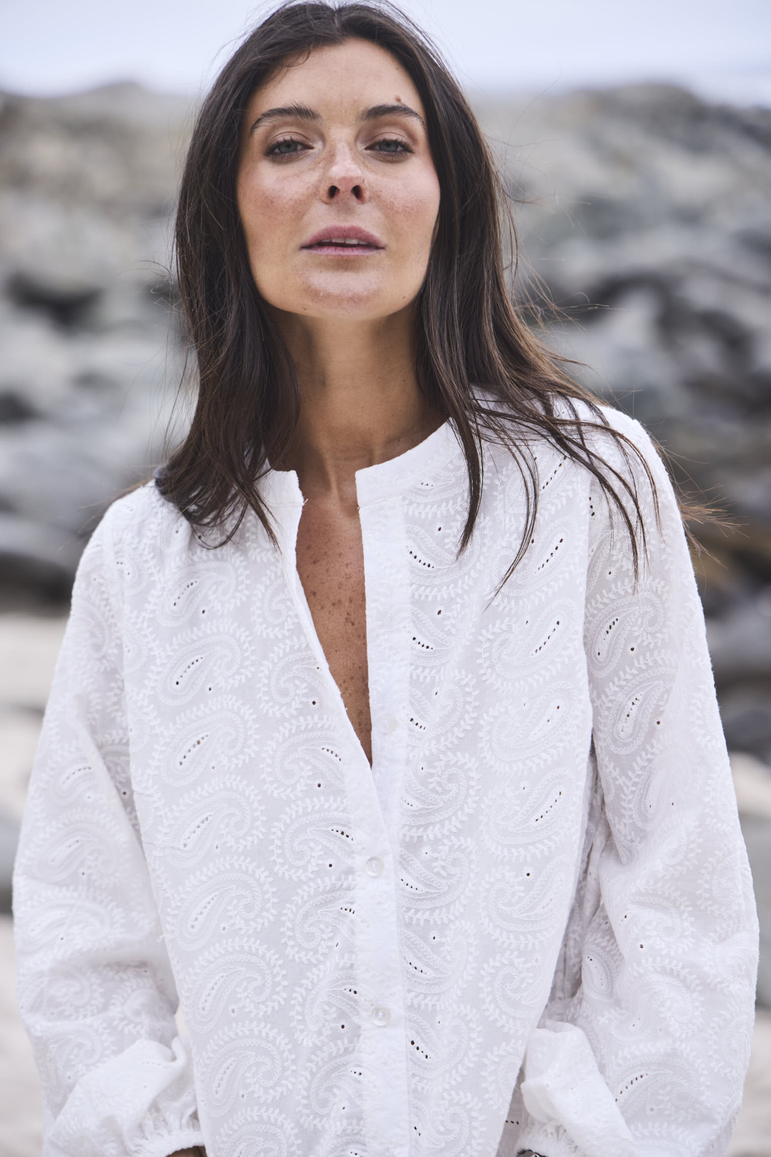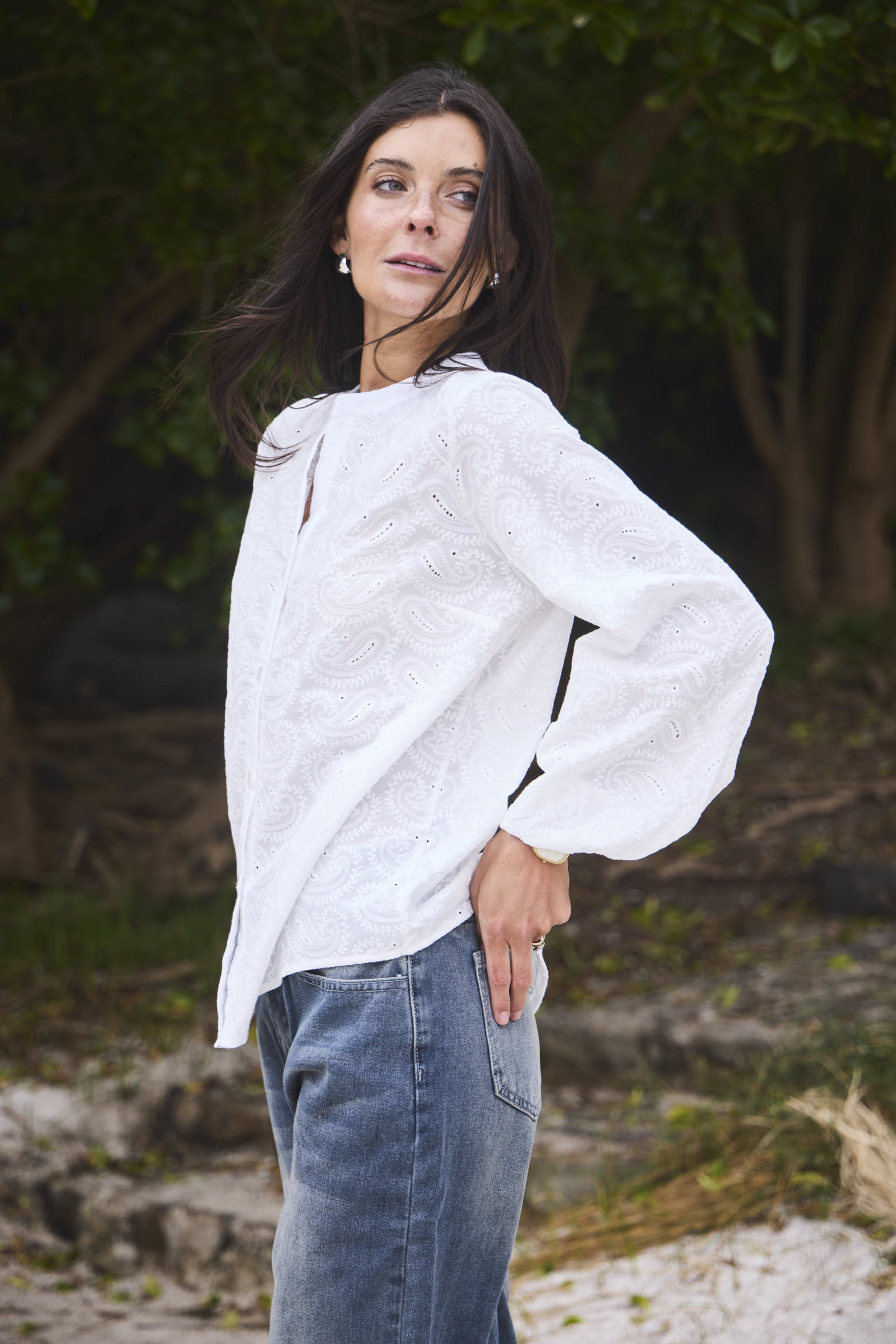 Blusa manga larga confeccionada en 100% algodón orgánico con delicado bordado broderie. De fit holgado y liviano, con mangas aglobadas que culminan en puños con amarra elasticada para un ajuste adaptable.