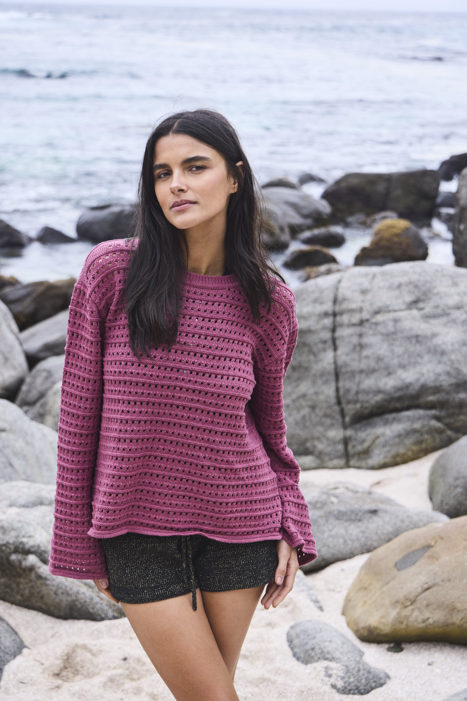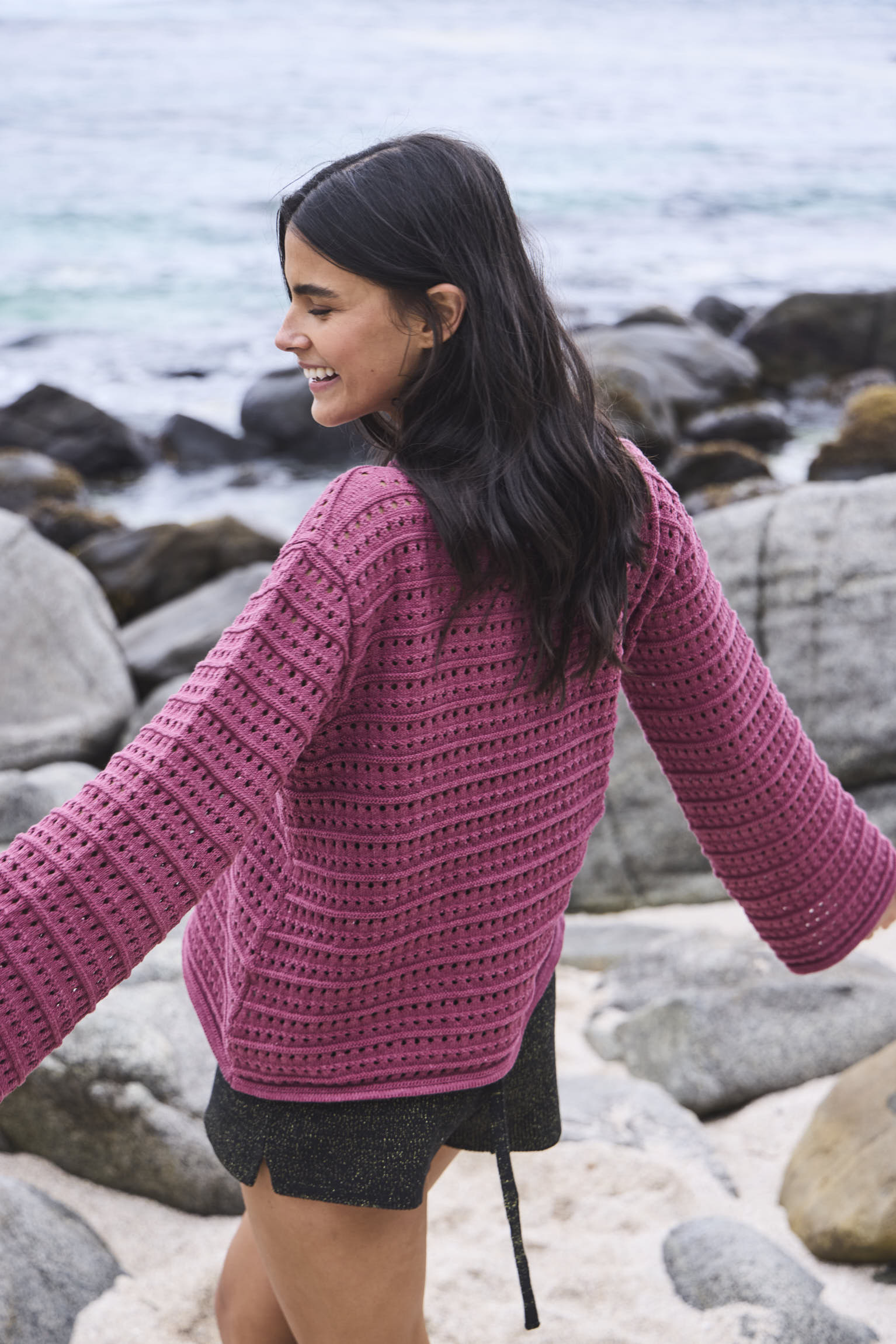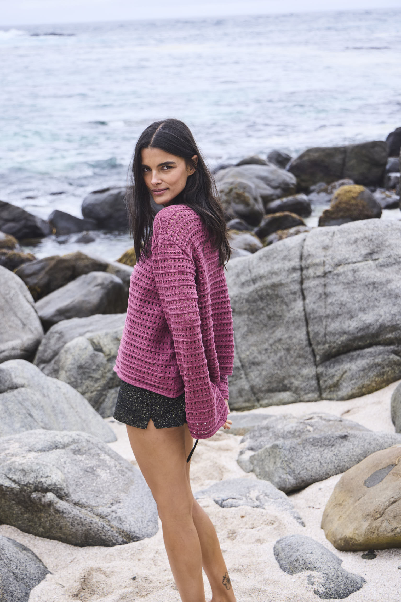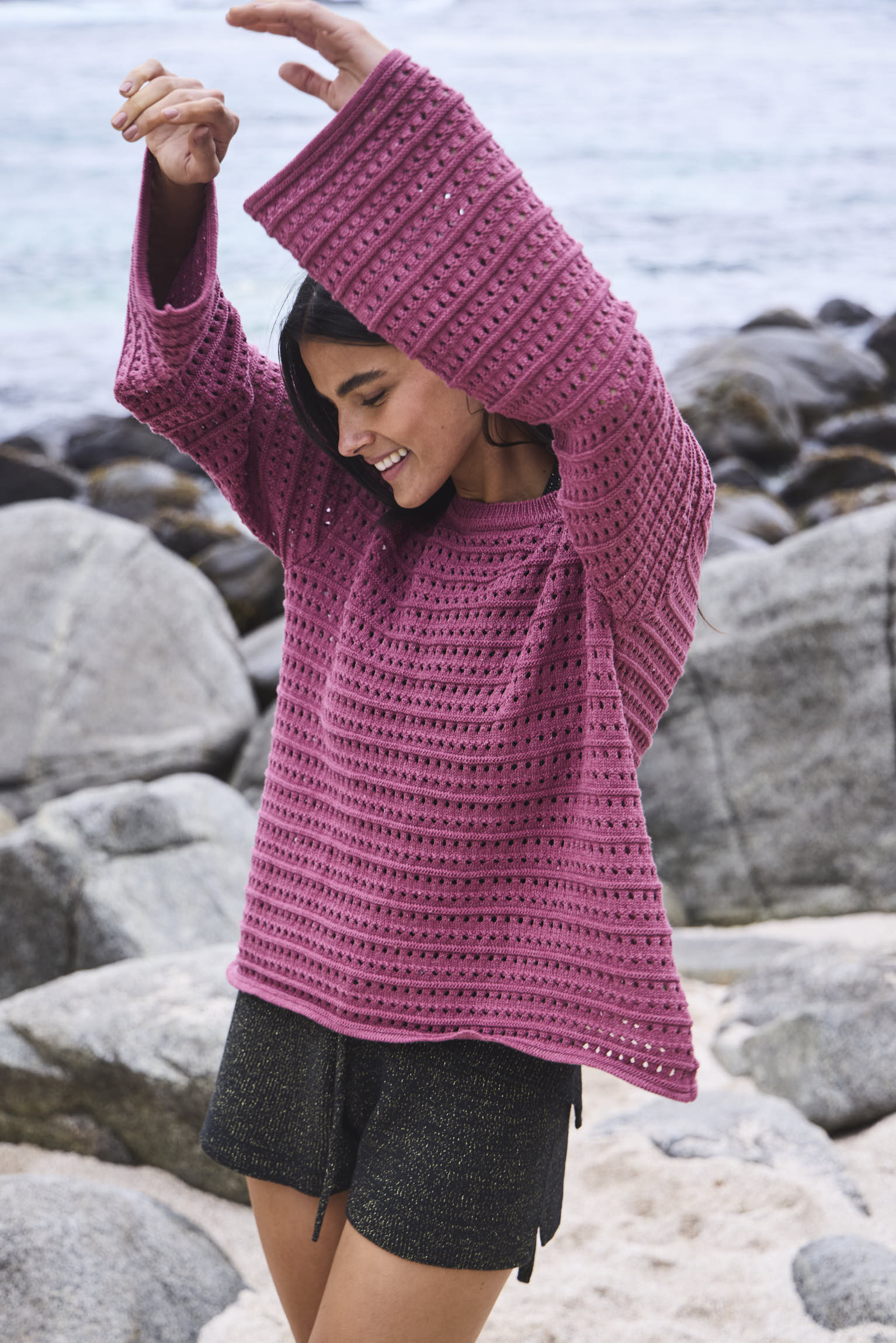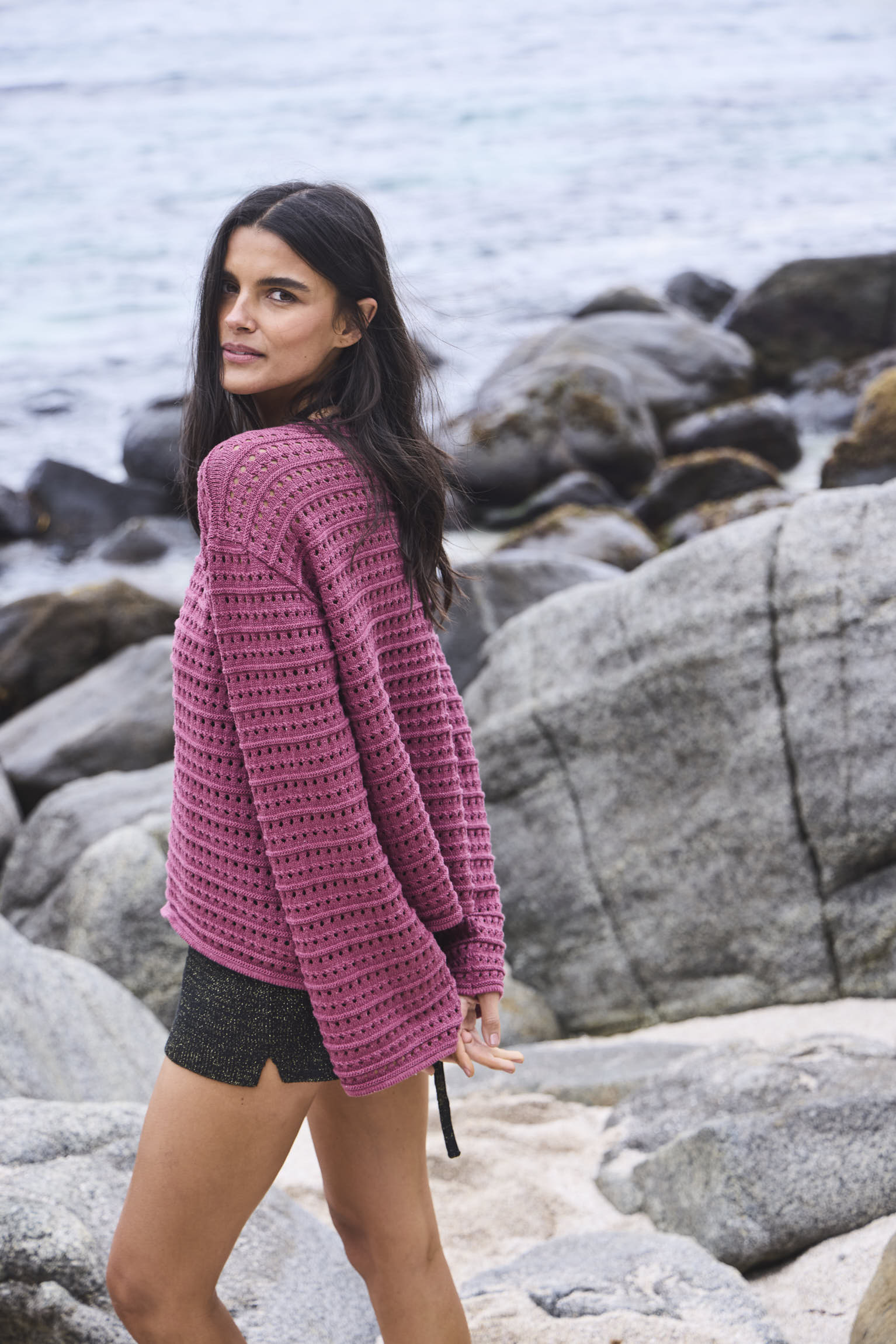 Chaleco de tejido calado confeccionado en algodón pima peruano, reconocido por su suavidad, resistencia y tacto premium. De calde holgado y mangas anchas, ofrece frescura y movimiento, ideal para elevar looks de verano con una capa ligera y versátil.