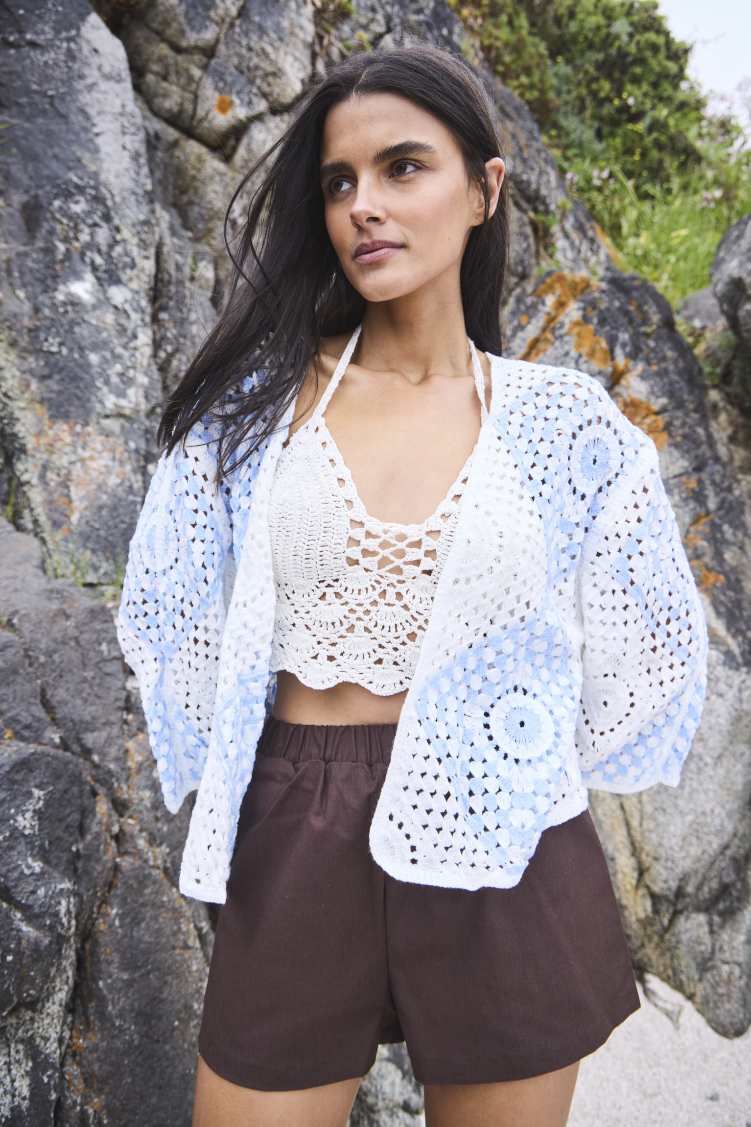 Chaleco abierto tejido a crochet confeccionado 100% algodón. Diseño bicolor en crudo y celeste combina artesanía y estilo, ideal para aportar textura y frescura a tus looks de verano. De calce suelto y cómodo, se adapta fácilmente a diferentes siluetas gracias a su talla única y caída liviana.