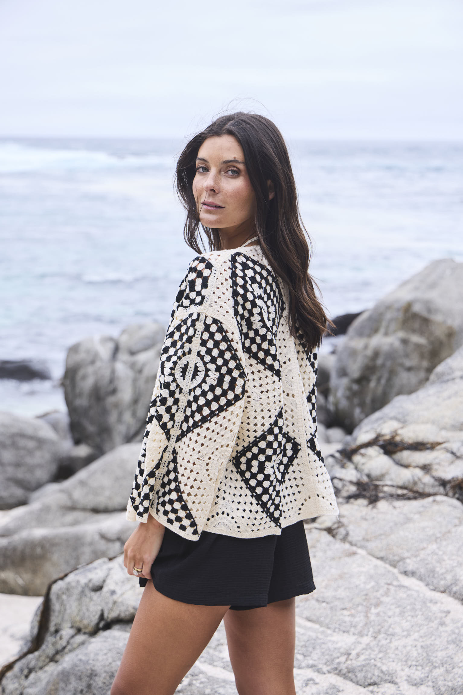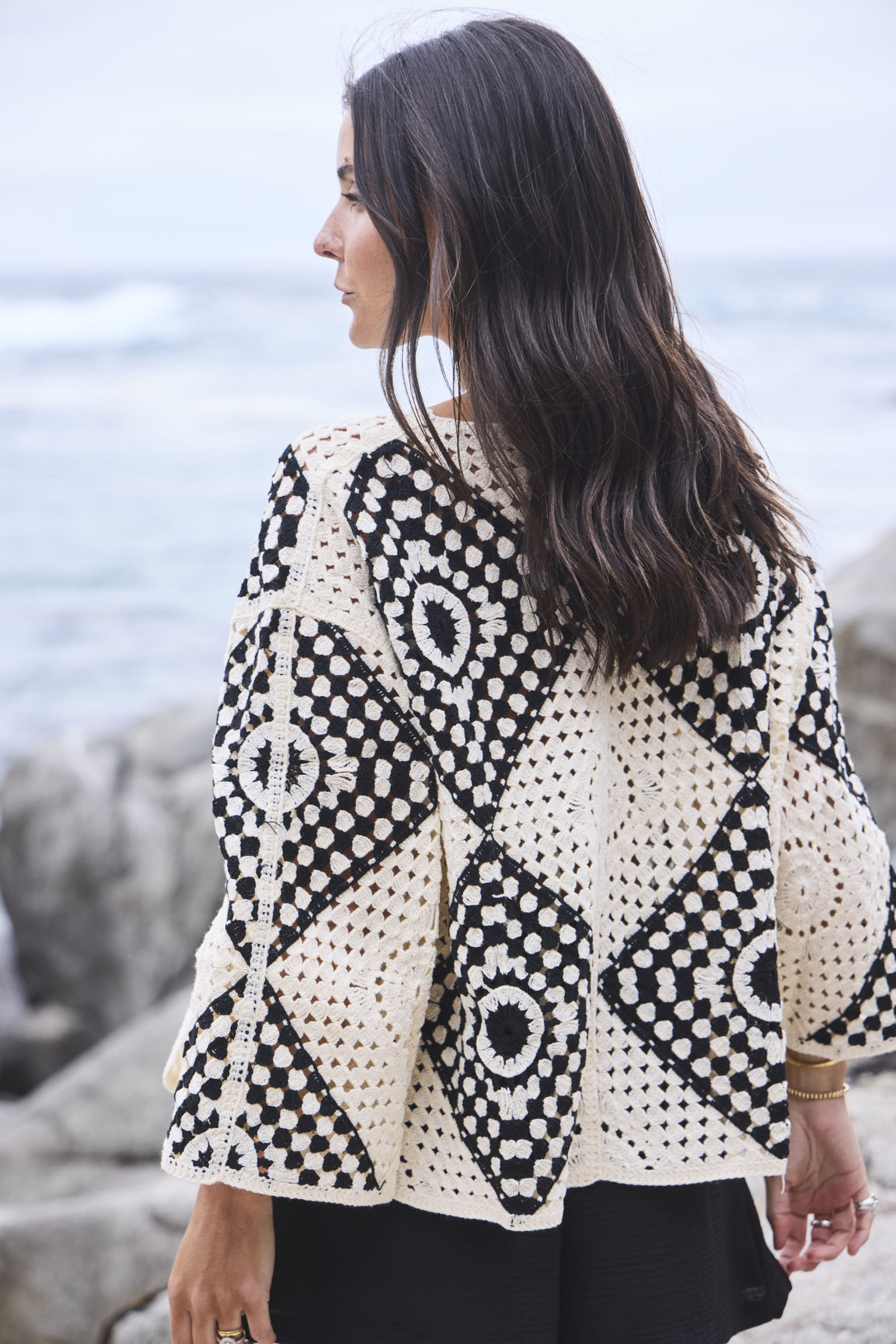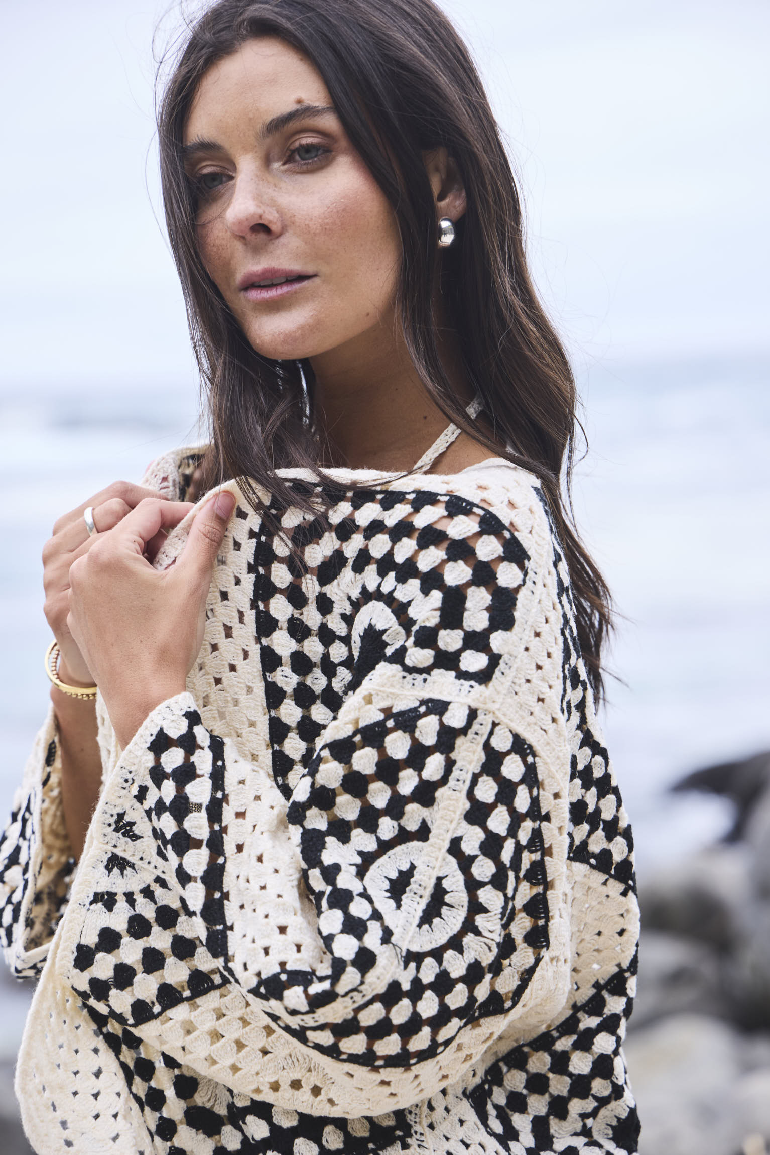 Chaleco abierto tejido a crochet confeccionado 100% algodón. Diseño bicolor en crudo y negro combina artesanía y estilo, ideal para aportar textura y frescura a tus looks de verano. De calce suelto y cómodo, se adapta fácilmente a diferentes siluetas gracias a su talla única y caída liviana.
