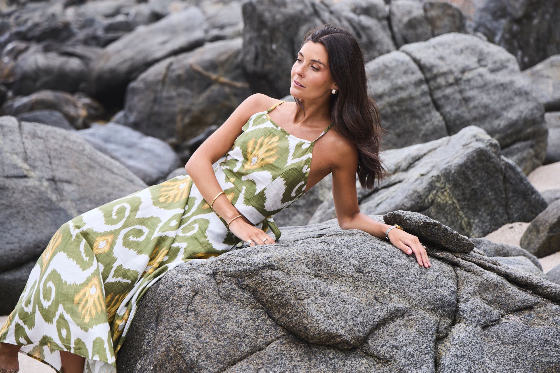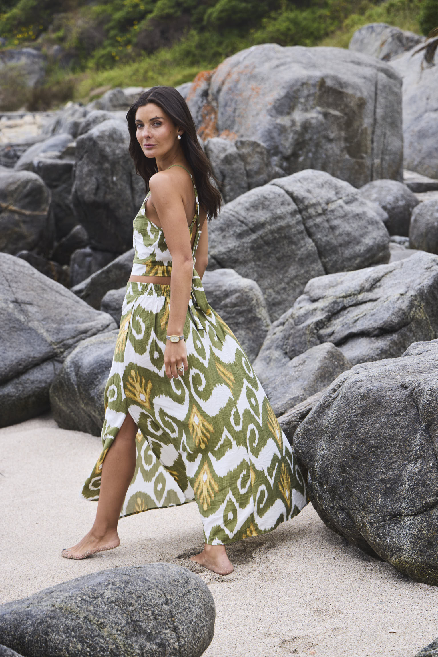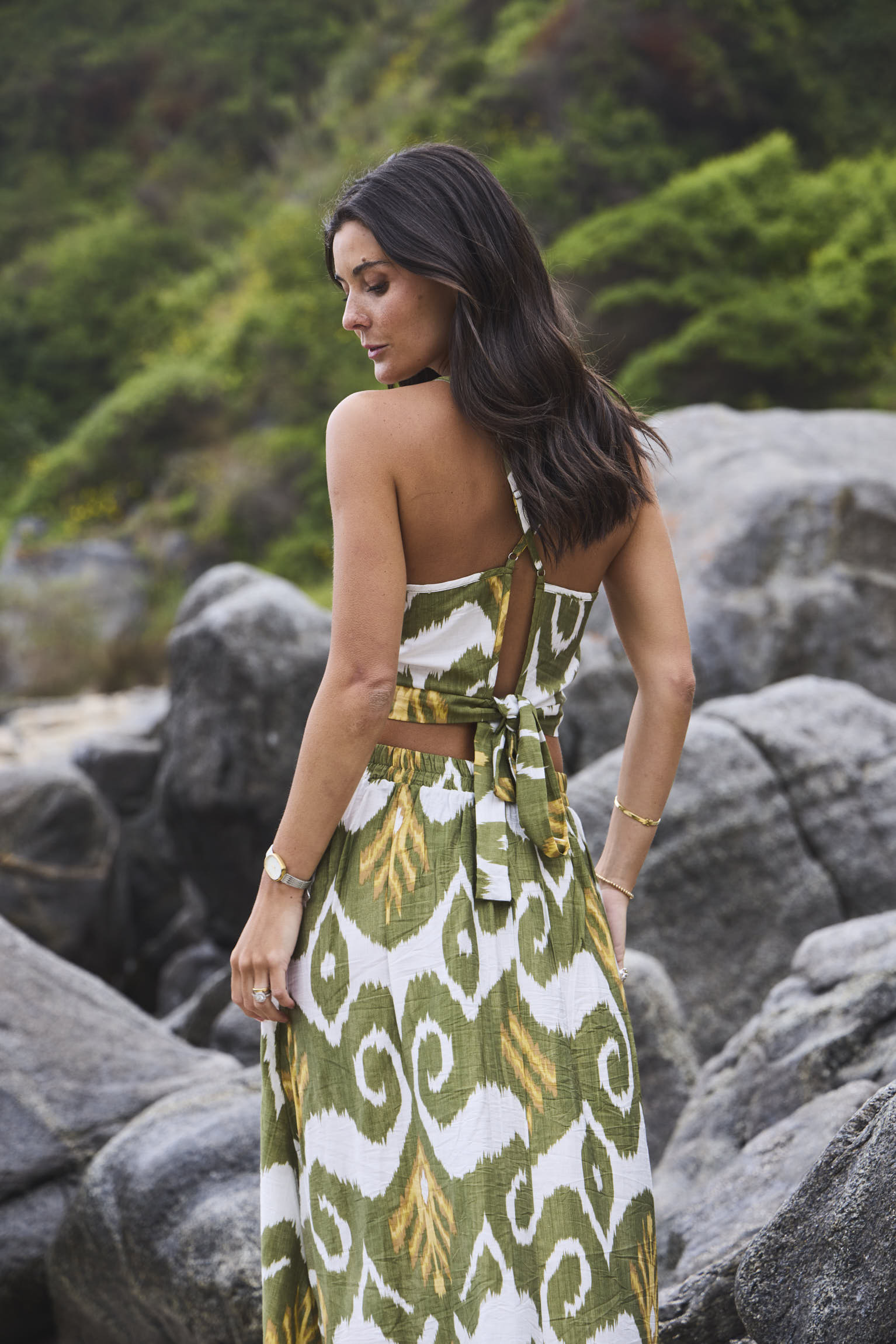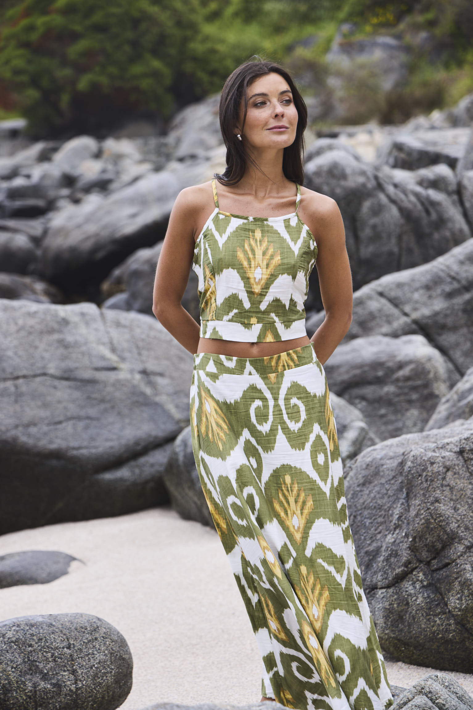 Conjunto de dos piezas estampado compuesto por top ajustable y pollera larga con cintura elasticada en parte espalda, lo que hace de prendas adaptadas al cuerpo creando sensación ligera de uso.