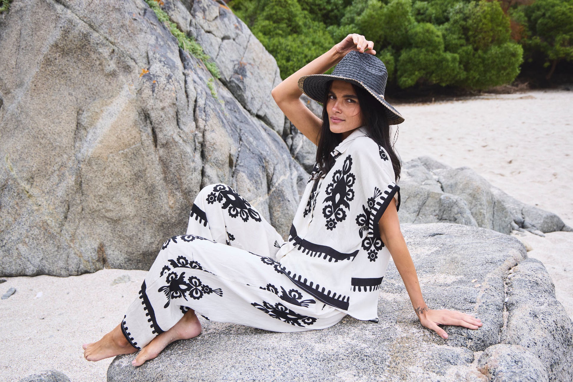 Conjunto de dos piezas confeccionado en 100% viscosa suave y liviana. Incluye blusa y pantalón de calce suelto, ideal para días cálidos gracias a su fresca caida y fluida.