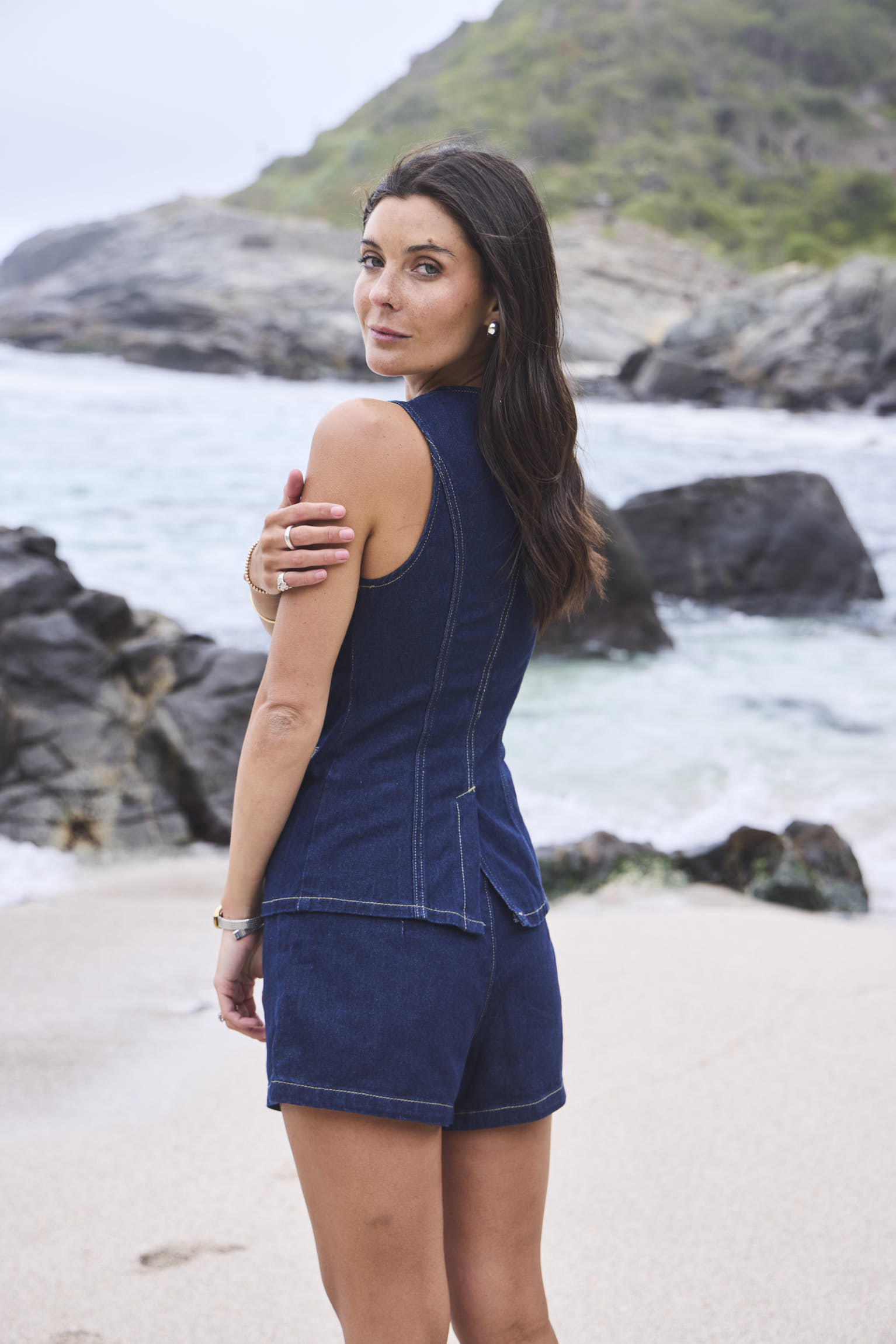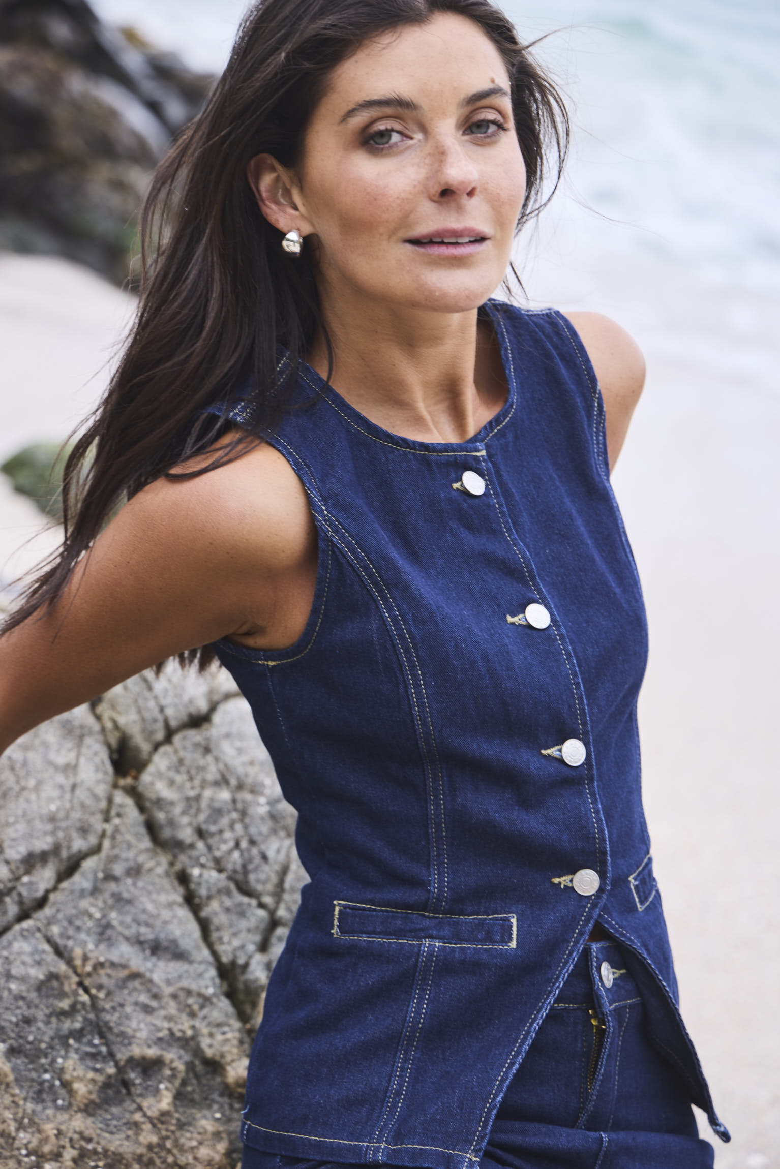 Gillet de denim abotonado al frente, diseñado con un calce entallado que define y acentúa la cintura.