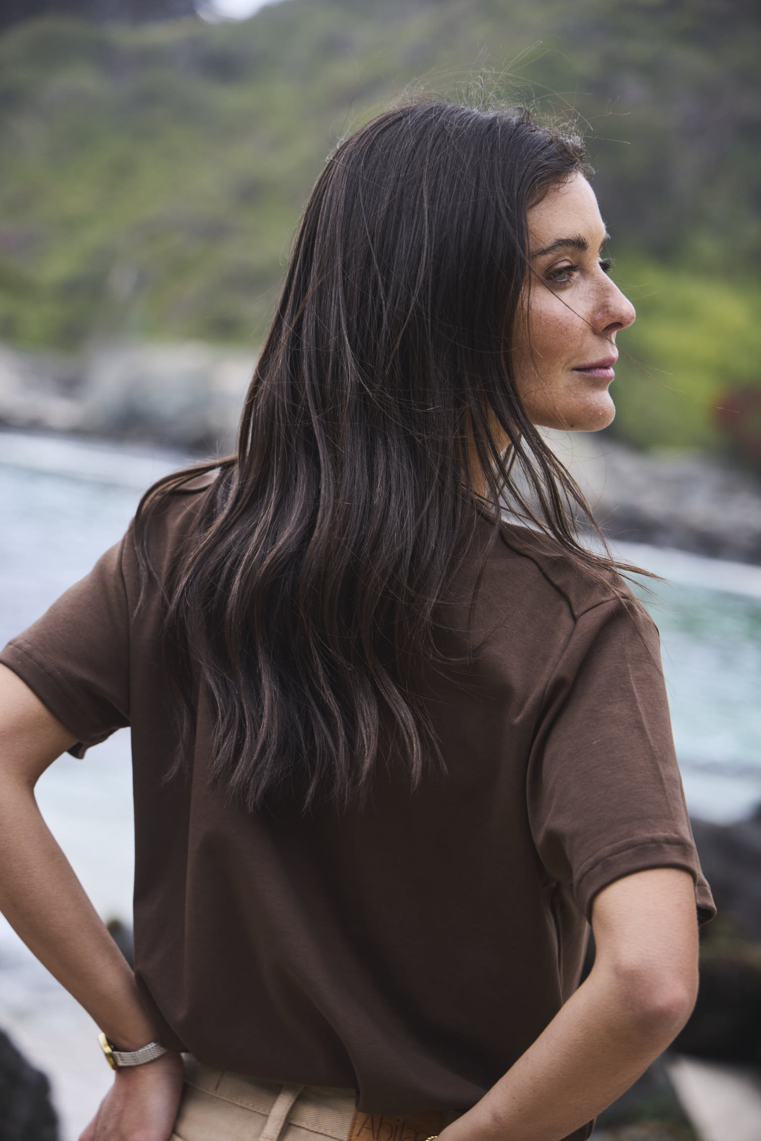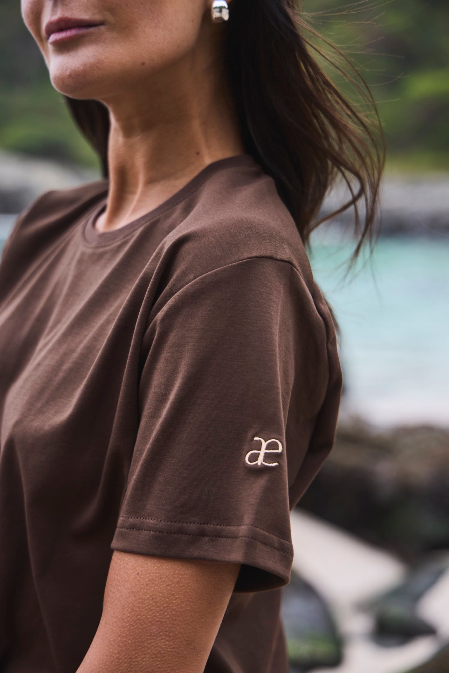 Polera de cuello redondo y manga corta confeccionada en 100% algodón peruano, reconocida por su suavidad y durabilidad.