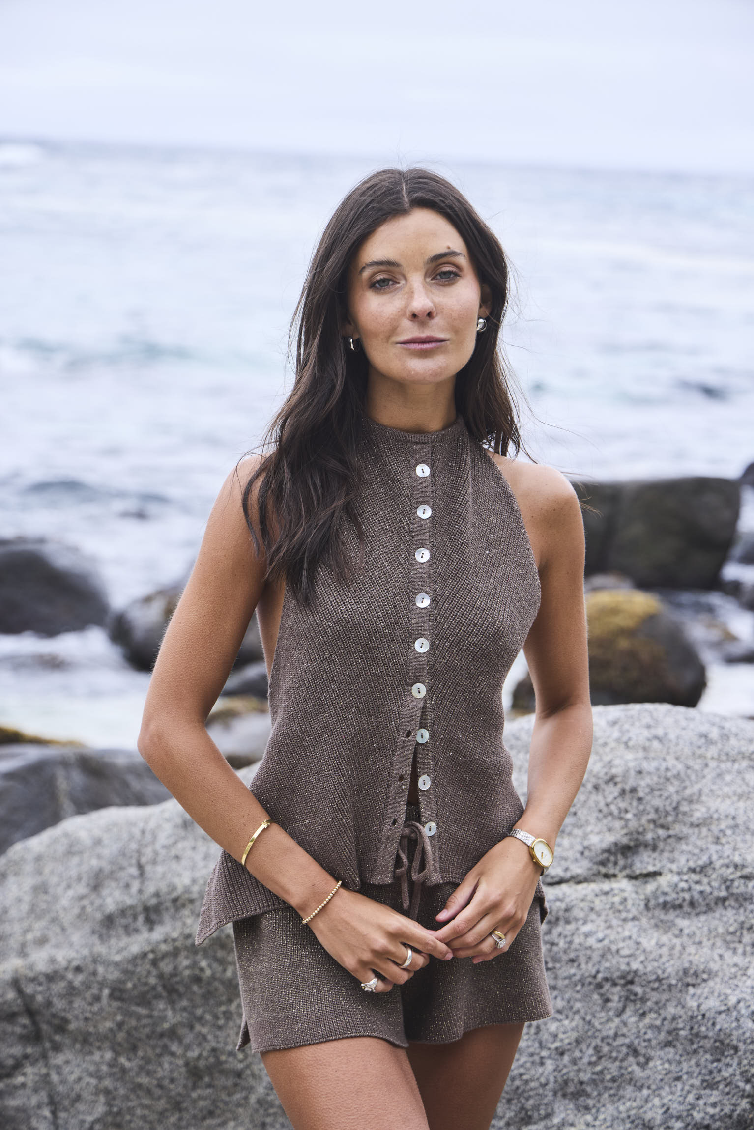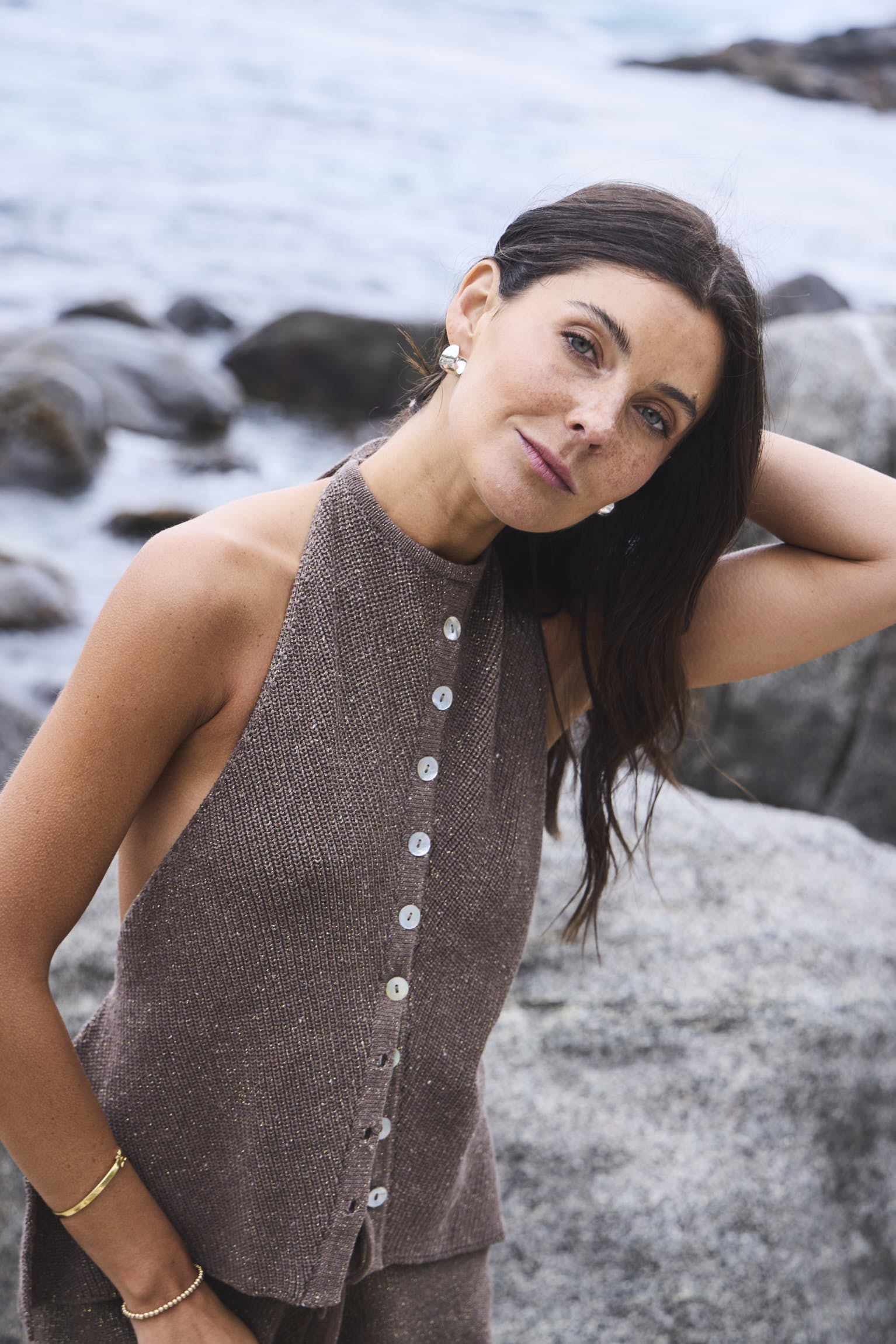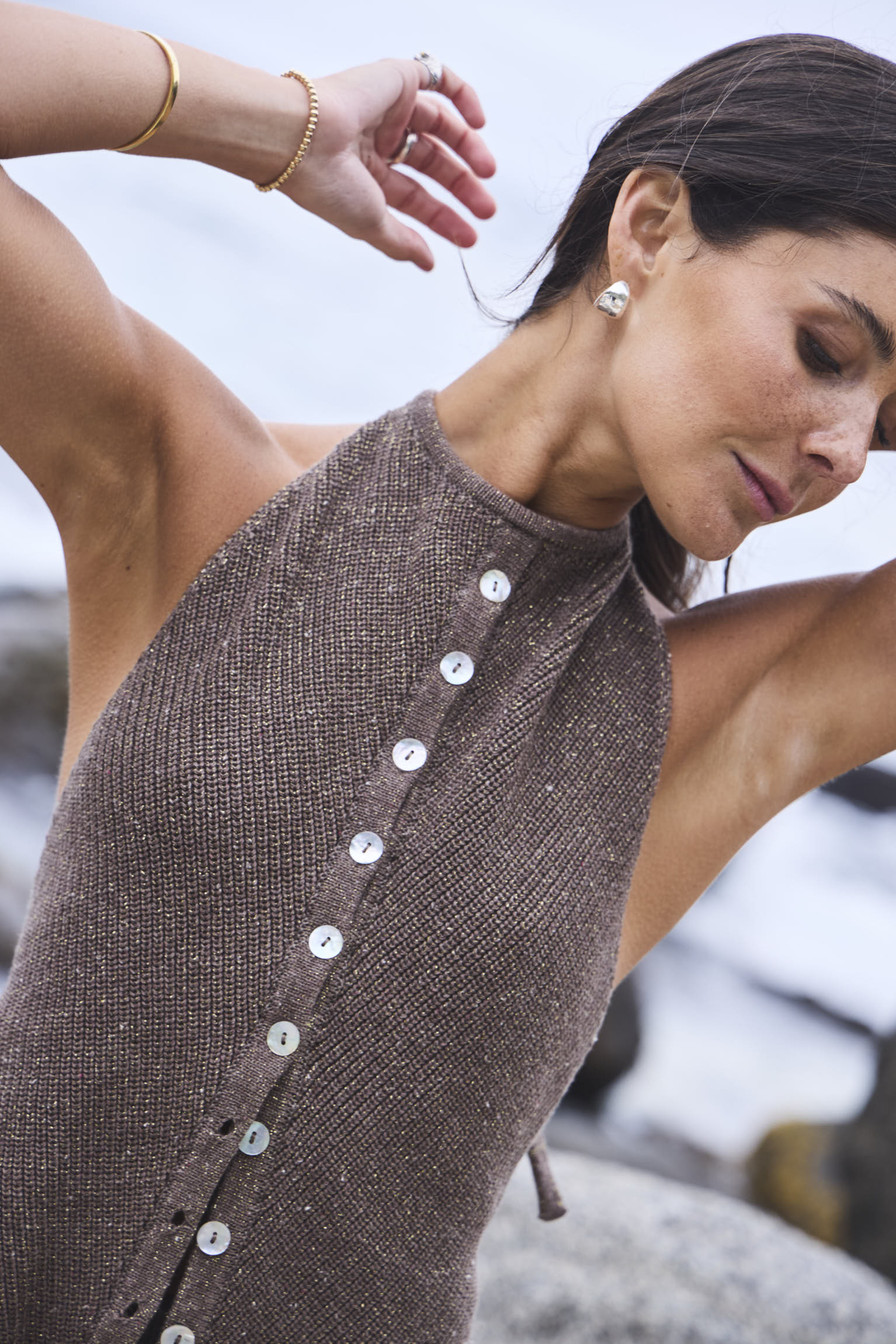 Top confeccionado en tejido de algodón peruano con delicados detalles en hilos dorados que aportan un toque sutil de brillo.