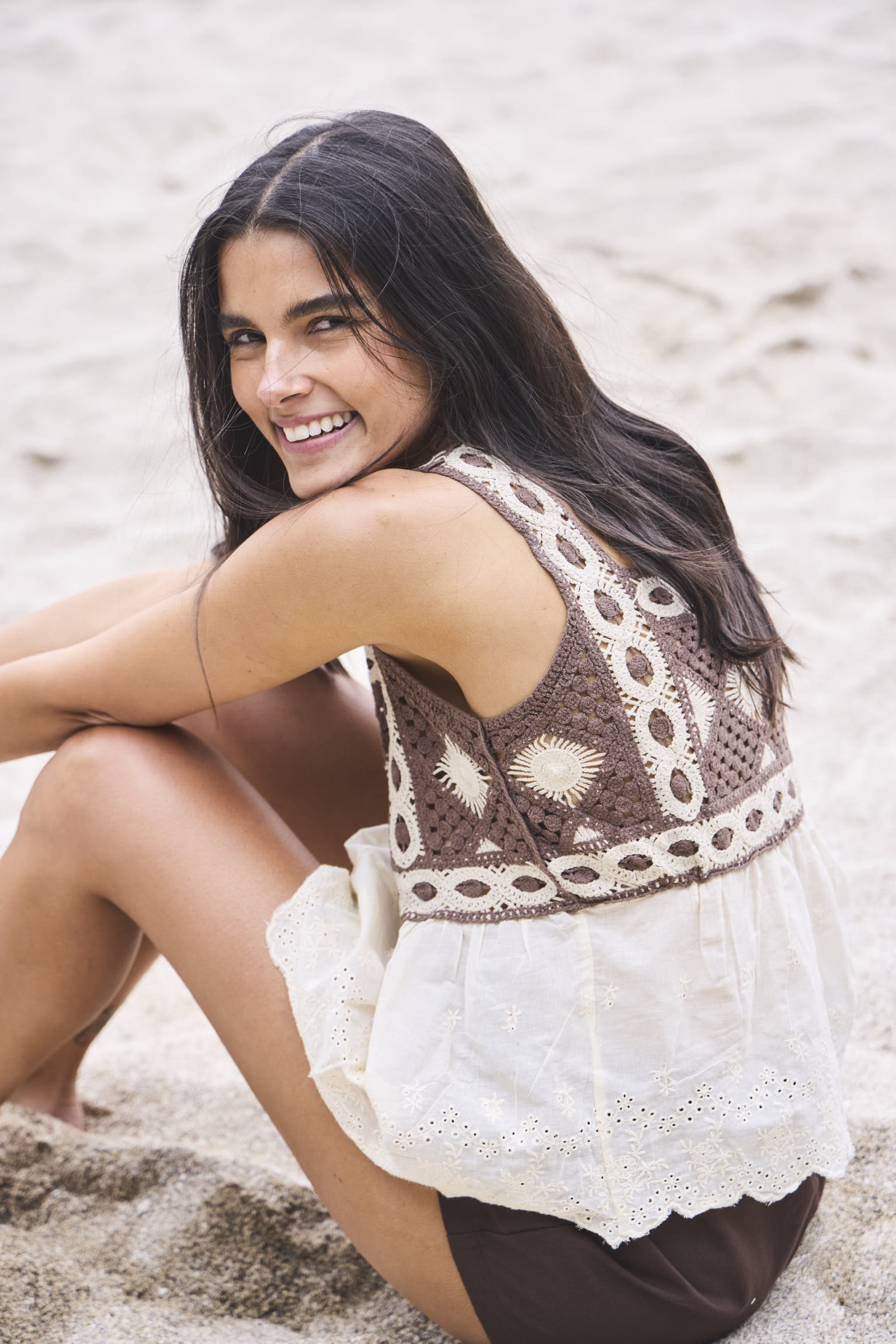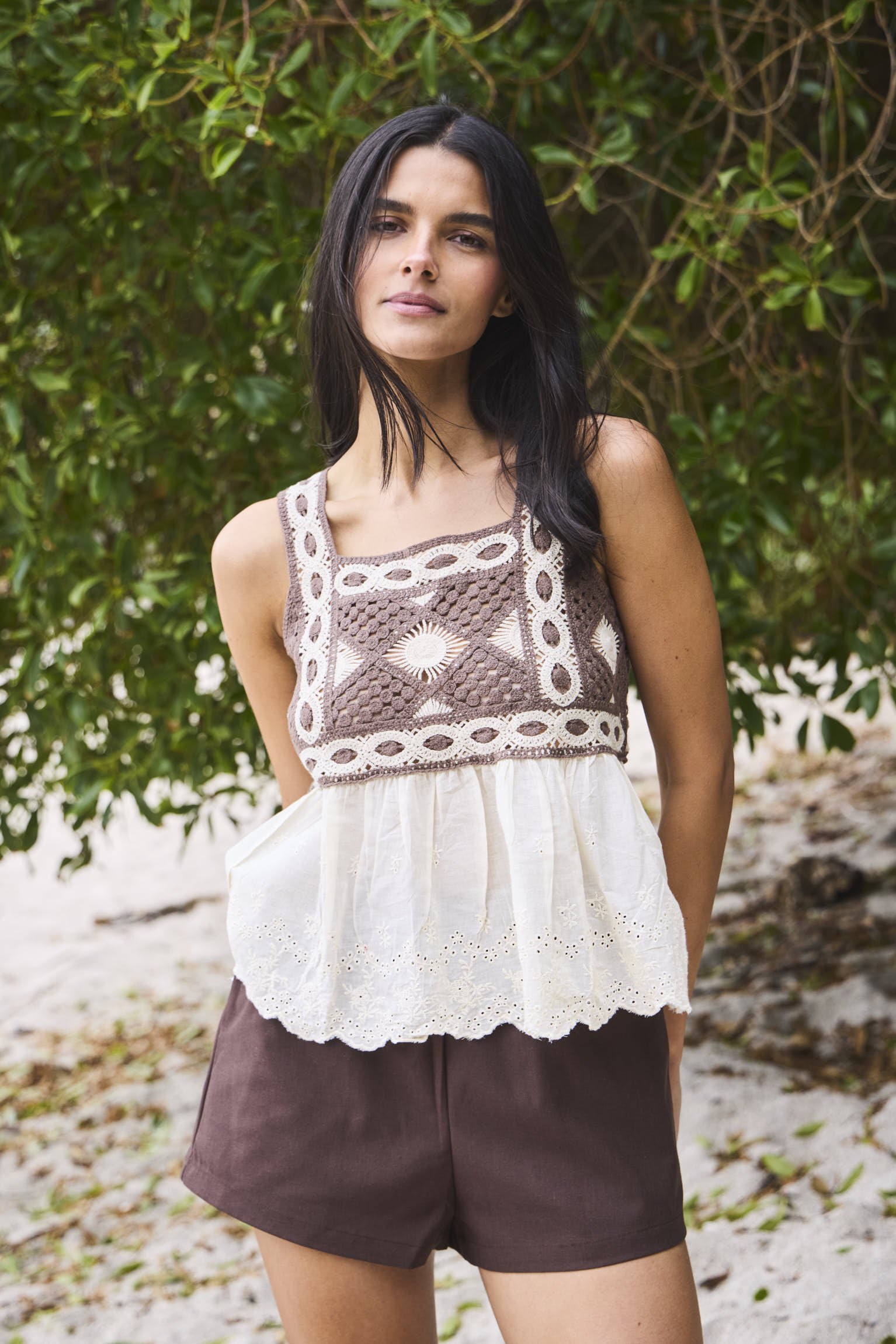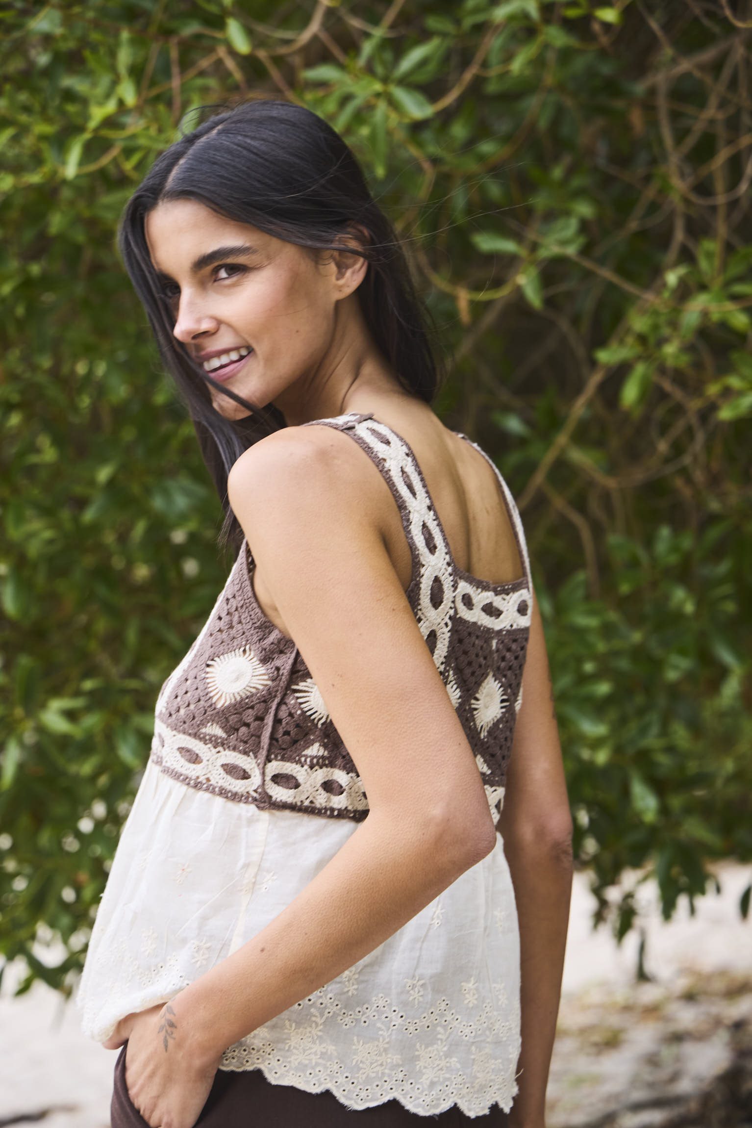Top combinado con parte superior tejida a crochet en algodón café y base de tela con delicado bordado broderie. Incluye tiras también tejidas a crochet para un acabado artesanal uniforme.