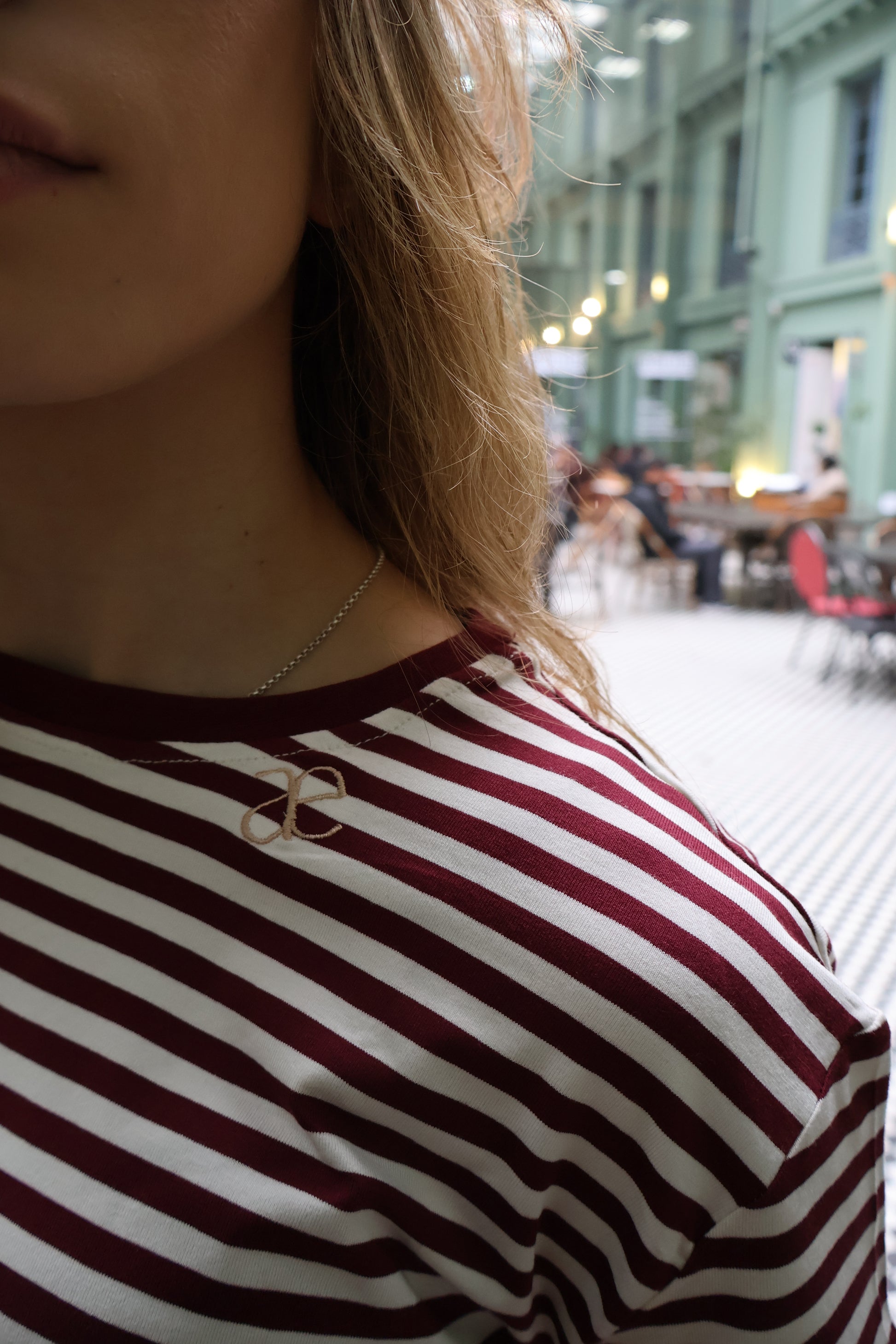 Top rayado en tonalidades burdeo y crudo, holgado, cuello redondo y manga corta.